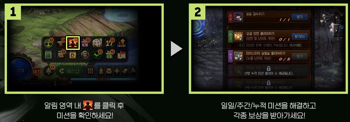 상급 던전을 클리어하며 미션을 해결하면 각종 보상을 받을 수 있습니다.