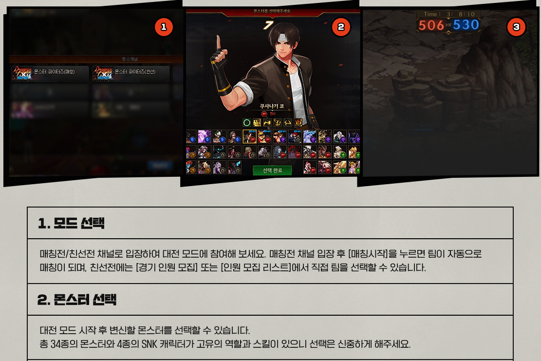 ( 3개의 SNK 캐릭터(쿄, 하오마루, 아테나)로 플레이 시작 가능하며, 주차별로 새로운SNK 캐릭터 획득이 가능합니다. )