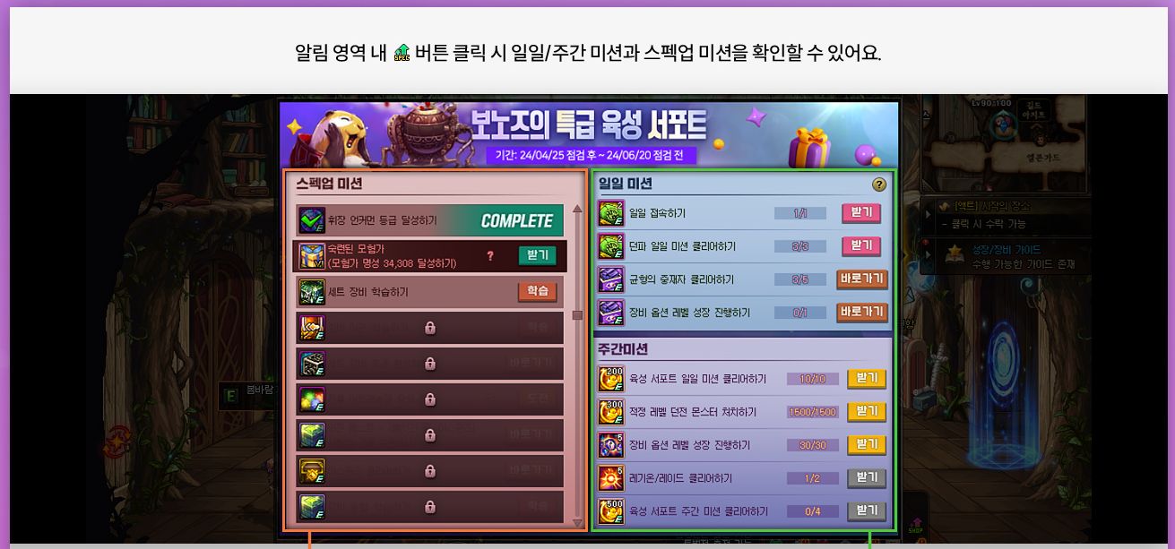 110레벨을 달성하게 되면, 스펙업 미션/일일 미션/주간 미션이 열리며,
