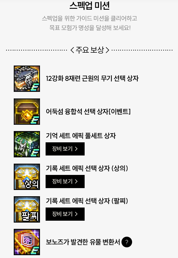 스펙업 미션의 주요 보상은 근원의 무기(12강 8재련) / 에픽 풀세트 등이 있습니다.