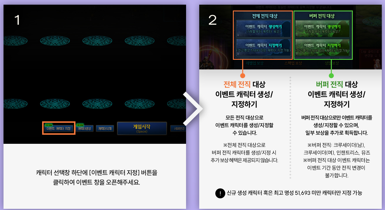 신규 캐릭터 혹은 명성 51,693 미만의 캐릭터 선택 ( 버퍼 캐릭터 포함 2개 지정 가능 )