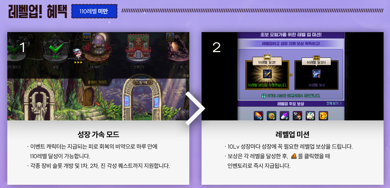 110레벨 미만의 캐릭터들은 성장 가속 모드를 통해 레벨업을 할 수 있습니다.