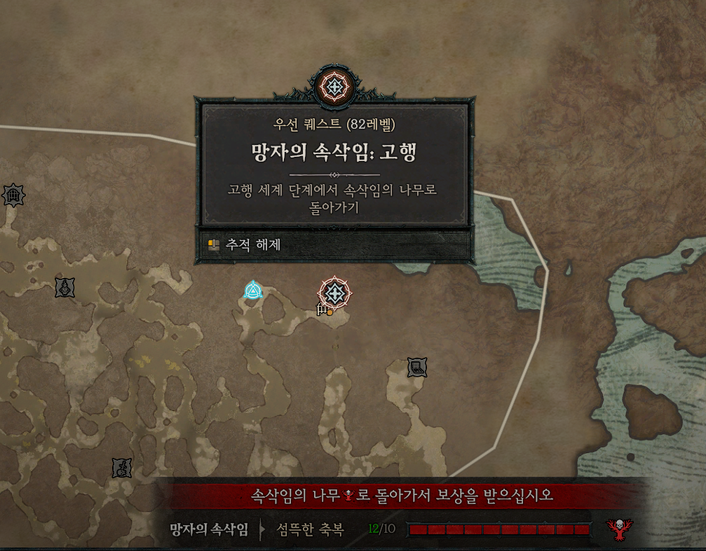 망자의 속삭임 채우는 방법은 미니맵에 아래처럼 표시 되어있는 부분 퀘스트 클리어하면 됩니다.
