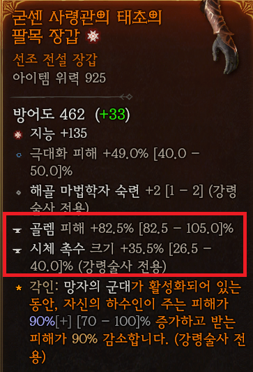강령술사의 경우 시체 폭발 크기를 늘릴 수가 있는데, 장비 특성에 1개만 추가하여도 눈에 띌 정도록 크게 바뀐 것을 볼 수 있습니다.
