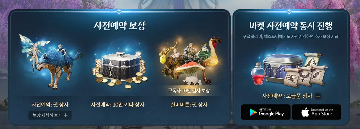 사전 예약 보상은 펫 상자 + 키나이며, 마켓 추가 사전예약 시 더 많은 아이템을 얻을 수 있습니다.